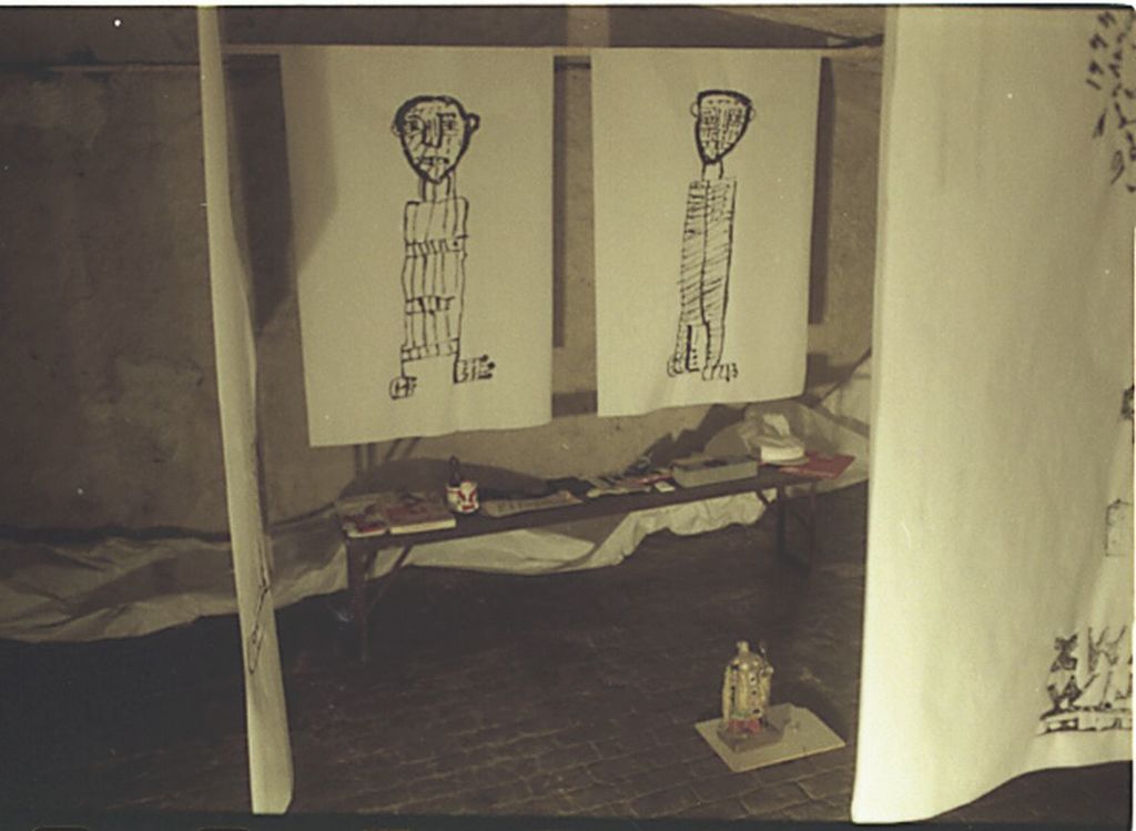 Original version of the 'three magi/black magus' exhibition in the cellar of AK-37, which could easily pass as a space in one of the underground churches in Lalibela... Banners with blow-ups of drawings from Jef's Ethiopian sketchbook with additional trinkets and attributes on chairs and benches – including small drawings on cigarette paper (laminated) – all presided over by Saint Nicholas.