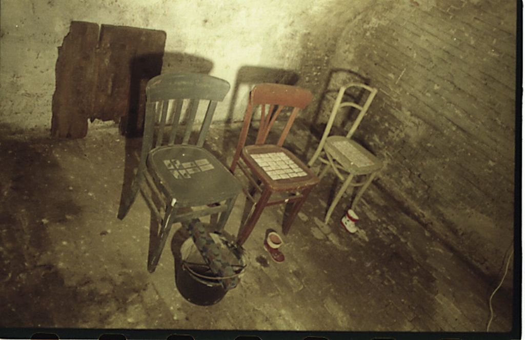 Original version of the 'three magi/black magus' exhibition in the cellar of AK-37, which could easily pass as a space in one of the underground churches in Lalibela... Banners with blow-ups of drawings from Jef's Ethiopian sketchbook with additional trinkets and attributes on chairs and benches – including small drawings on cigarette paper (laminated) – all presided over by Saint Nicholas.